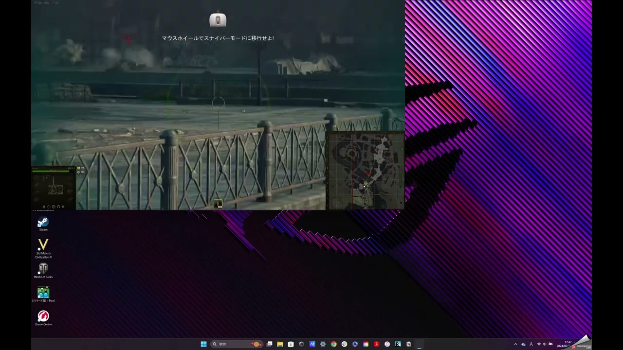 次に、World of Tanksをプレイしている様子がこちら。チュートリアルモードですが、実際に操作をしてみましたが違和感なく遊べました。このゲーム、戦車を操縦しての対戦ゲームですが、相手の攻撃を避けつつ、照準器を使って狙いを付けねばならず、かなりコツがいりそう。実際の戦車戦がこういうものなのかは分かりませんが、ゲームとしては良くできています。そして、ROG Zephyrus G14 GA403を使えば、動作がもたついて相手に隙を与えることなく、撃破することができるのでありました。